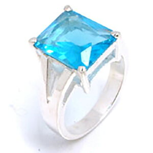肉厚なシルバーリングのトップに透き通るような大きなアクアのキュービックジルコニアがついたジュエリーリング。スクエアにカットされ、大胆にセッティングされたキュービックジルコニアが存在感を放つジュエルリングです。立体感、