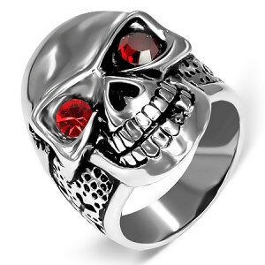 大きく見開いたドクロの目に赤のジルコニアをセットした不気味なスカルリング。スカル好きにオススメの指輪です。丈夫で半永久的な輝きを見せてくれる高級感のあるステンレスリングは、毎日の普段使いから、フォーマルなパーティース