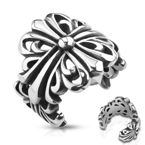 たおしゃれなステンレスリングです。 高級感のある紋章のなフルールクロスは男性からも女性からも人気の指輪。 透かし彫りされたボディとワイドに広がるクロスが