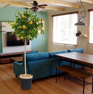 丸くて可愛いレモンの木、人工観葉植物なので葉が伸びず整った樹形のまま飾れます。幹は和歌山県産の天然木、造花の質感や色合いもリアルでレモンの実は本物そっくりの高品質な食品サンプルを使用しています。