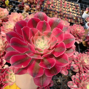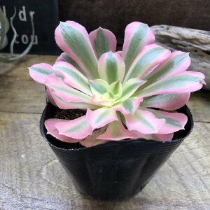 アエオニウム『ピンクウィッチ』です。 名前の通り、紅葉期に白斑がピンク色に染まる美しいアエオニウムです。 葉は柔らかく、葉先は丸く広がります。 大きくなると20cmほどのロゼットに成長します。 ※日照の関係により...