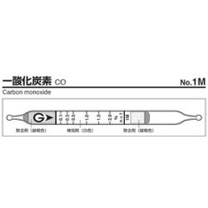 ガス検知管 一酸化炭素 (1箱) 検知管名:1M 一酸化炭素。1箱の測定回数:10。有効期限(年):3。 測定ガス名:一酸化炭素。測定範囲:0.05〜4.0%。標準吸引回数(n):1。 。