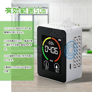空気中の二酸化炭素濃度を測定、設定値を超えると音と光のアラームでお知らせ オフィスや倉庫等の室内環境改善に アラームは1ppm単位で2段階の設定が可能。 電源はUSB充電可能な3.7Vリチウム電池