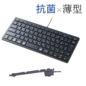 無駄を省いた薄型&コンパクトキーボード。抗菌仕様。※箱にキズ、汚れがありますが商品は新品です。<特長>●最薄部7mmの超薄型形状です。最厚部でも22mmで持ち運びや収納に便利です。●ノートパソコンと同じパンタグラフキー方式を採