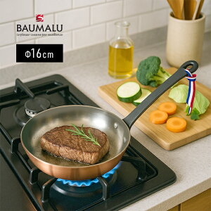 BAUMALU ボウマル 銅のフライパン 16cmの解説 火加減が決め手の料理に、プロ仕様の一枚。 熱を操る、美味しさの道具。 熱伝導率に優れた銅製だからこそ、火の入り具合が命のステーキや魚のソテーも思い通りの仕上がりに。 表面は香ばしく、