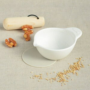 サイズ:すり鉢-約直径13.5×高さ5.6cm、すりこぎ-約直径2.5×高さ18cm 素材:本体-陶器(すべり止め-シリコンゴム),すりこぎ-天然木 生産国:日本 付属品:すりこぎ
