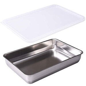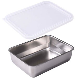 サイズ:約 バット/幅22×奥行15.5×高さ3.5cm 角型ザル/幅22.5×奥行16×高さ3.5cm フタ/幅22.5×奥行16×高さ1cm。重量:約 バット/150g 角型ザル/115g フタ/75g。材質:バット・角型ザル/ス...