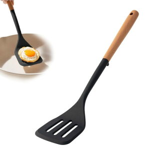 先端がシリコン製のキッチンツール。食材による色移りが目立ちにくい黒(ブラック)を採用!樹脂製のため、フライパンやお鍋などの内面加工を傷めません。耐熱温度が高く炒め物などにもご使用いただけます。お菓子作りにお役立ち!生地