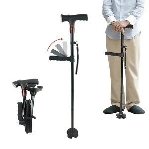 超高性能!多機能折りたたみ杖。4点自立式杖で手を離しても杖が倒れず安心。杖の先は360°回転式で凸凹道や階段、坂道などの不安定な場所でも快適でより安全な歩行を実現!