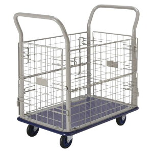 [特長]:■金網は脱着式です。■荷台の材質にハイテン鋼(通常の鉄板と比べ15%軽量かつ高強度の鉄板(積載面))を採用したスチール台車です。■タイヤはクッション性・静粛性に優れたブタジェンゴム(BR)を採用しています。[ご注意]