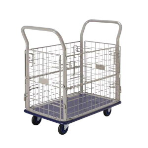[特長]:■金網は脱着式です。■ハンドル取付位置の台座内部に補強金具が入っているので使用によるガタツキ発生を抑えます。■台座周囲はクッションゴム、積載面にはすべり防止マットを装着しています。■タイヤはクッション性・静粛