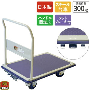 ●ハンドル固定式スチール製台車。 ●工場、倉庫、店舗での運搬作業使用備品に。 ●足踏みペダル式ブレーキ付き。 ●積載荷重300kg。 ●ペダル式フットブレーキシステムを採用。 ●荷台の材質にハイテン鋼を採用、従来品と同強度で約15%
