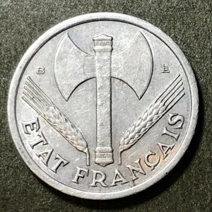 Rare WW2 French 1 Franc With "B" Mint Mark, 1944, KM902.2。1944年製造国/地域:フランス。額面:1フラン。流通/非流通:流通済み。材質:アルミニウム。KM番号:902.2。