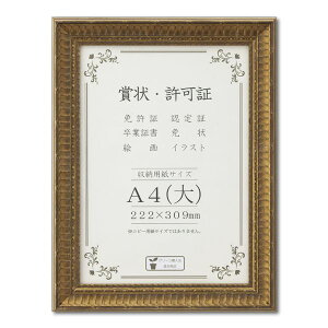 賞状が映える「金消」の額。●賞状額●タテ・ヨコ吊り下げ可●規格:A4(大)●質量:375g●外形寸法:縦358×横271×厚17mm●収容寸法:縦309×横222mm●材質:枠=PS、表面材=PETシート...