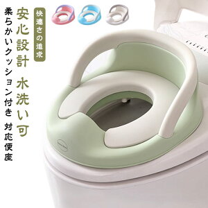 お子さまのトイレの練習にぴったりの補助便座。【柔らかいクッション付き】【水洗い可】【安心設計】自力でトイレができるよう人間工学に基づき設計。両サイドに丁度いいサイズの取っ手(ハンドル)を設置。おしっこ飛び散りを防ぎ男