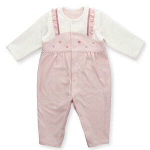 素材 綿(接結) 100% ●日本製 お花の刺繍が入ったサロペット風のデザインが目を引く長袖カバーオール。 やわらかく保温性のある接結素材だから、秋から春先まで活躍します。 肌寒い季節に保