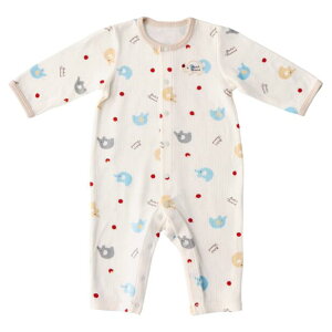 2枚の生地を合わせた接結素材は間に空気を含むので、ふんわり暖かく 秋・冬におすすめの素材。男女兼用のかわいい長袖カバーオール。 やわらかく保温性のある接結素材だから