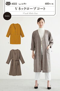 深めのVネックとIラインシルエットがすっきりシャープな大人っぽいローブコート。 サラッと羽織れて着まわせ、ロングシーズン活躍。 Aはひざ上丈・スナップ留め。Bはひざ下丈・ベルトつき。 適した布地:中薄から中肉程度の布地 (先染/リ