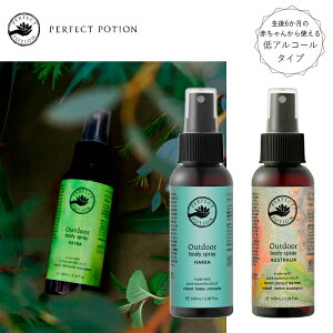 商品説明パーフェクトポーション アウトドアボディスプレーは、赤ちゃん(生後6ヶ月)から大人まで、家族みんなで使える夏のアウトドアライフのための天然アロマが香るボディスプレーです。夏の外出時、公園へのお散歩から、アウトドア、