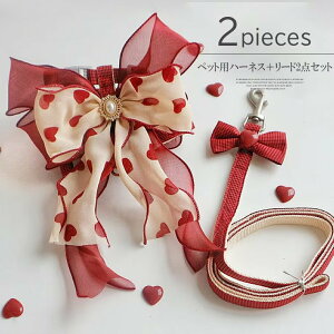 お散歩が楽しくなるリード付き2点セット! ペット用品 ペットグッズ リード 犬用 猫用 リード&ハーネス セット 超小型犬 子犬 お散歩 胸ストラップ 首輪 お出掛け ペットリード リボン ハート■ ...