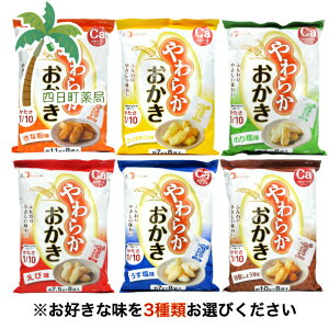 やわらかおかき商品情報 商品説明 ●全6種類の中から、お好きな種類を3つお選びください。 ●一般の堅焼きぜんべいに比べて1/10のやわらかさで、口の中です?っと溶けます。 ●やさしい味付けに仕上げてありますので、お茶はもちろん、色