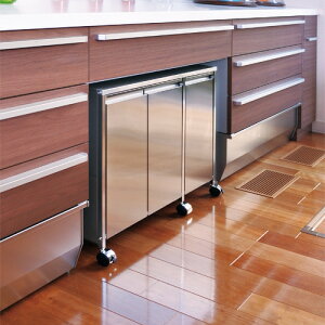 一見してダストボックスには見えない、清潔感溢れる洗練された外観。表面に細かなヘアライン処理を施し、手垢などが目立ちにくく、また分別もできて機能的。キャスターとアジャスターが選べる2way。