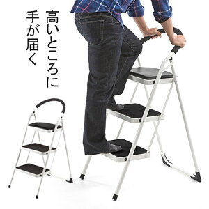高いところに手が届く、簡単に設置できる3段脚立!大きめのステップで安全に昇り降り。折りたたんで収納、移動可。