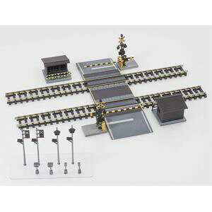 セット内容:第1種踏切(警報機・遮断機×2、スロープなど)、第4種踏切(警告標識×2、スロープなど) 本体サイズ(警報機・遮断機1個あたり):W60×H35×D10mm