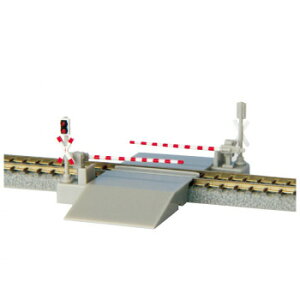 安価/手軽に雰囲気を楽しめるダミーの踏切線路。長さ124mmの踏切部直線線路 (リレーラー線路)を含む単線踏切フルキット。警報機・遮断機を完備した実物の「第一種踏切」のリアリティをフロアレイアウトで