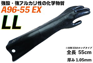 品番A96-55EXカラーブラックサイズL、LL材質表面:CSM 裏地:ポリエステル長さ(mm)550厚み(mm)1.05掌幅(mm)L:122 LL:133中指長(mm)L:83 LL:82入数1双