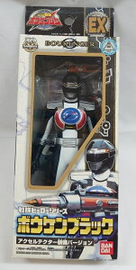 ボウケンジャーのソフビ、 「ボウケンブラック (アクセルテクター装備バージョン)」です。 【全高約16cm】 ボウケンブラックがデュアルクラッシャー専用の プロテクター、アクセルテクターを装備した姿。 カ