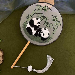 ・カテゴリ: うちわ・素材: 絹・サイズ: 扇面直径21cm、持ち手15cm・技法: 刺繍・骨組み素材: スチールリング・スタイル: 中華風・カラー展開: 藕色・柄: パンダ柄(両面、絹巻き縁、5種)
