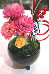 コケ玉を使った造花アレンジです。 縁起のいい福鳥もついていますよ。 福鳥は金運アップにいいとされるカラーのイエローをお付けします。 いい年を迎える準備をしましょう!! 鉢サイズ φ9×H7cm 全体の高さ約22cm...