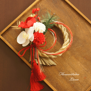 商品情報使用花材・縄:い草製・アーティフィッシャルフラワー(椿/梅/マム/胡蝶蘭/松)・水引・タッセルサイズ27×23センチラッピングセロファンでのラッピングになります。注意事項◎仕入れの状況により、...