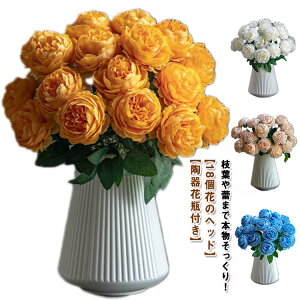 植物。【18個花のヘッド】【陶器花瓶付き】花粉がないので花粉が嫌いな方でも花の美しさが楽しめます!造花花束なので、花瓶に入れて家を飾り可能です。世話、水なども不要