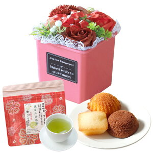 ソープフラワーポット&日本茶&プチケーキセット 商品説明 誕生日や記念日、結婚祝いなどにはもちろん、 母の日や父の日、敬老の日などの季節の贈り物や いつもお世話になっている方へのお返しギフトにもぴったりなギフトセットです。