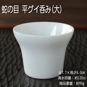 利き酒をする際に使われるお猪口です。お酒の透明度を、蛇の目という器にの内側に描かれた青い渦巻き模様を見て透明度や着色の様子を見極めます。お酒に濁りがあると白と青の境目がぼやけてみえます。冷酒でも熱燗でも季節に応じて晩