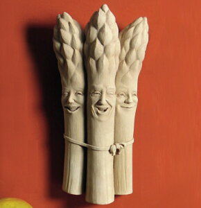 ガーデンパーティーは陽気なアスパラガストリオにお任せ。キッチンに飾れば、笑いのスパイスで皆様をおもてなし!アメリカ製(オハイオ州)デザイン:彫刻家 ジョージキャラス (George Carruth)主原料:ライムストーン、セメント屋外使用可