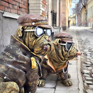 かっこよすぎるブルドッグの置物2つセットです。 玄関先や庭はもちろん、お部屋などに置くとインパクト大です。 ゴリゴリの革ジャンに葉巻、厳ついグラサンに大量のピアス。 これ以上にないかっこよさを身に着けているブルドッグの親子