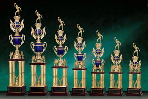 1.高級ラインの木製台・樹脂製トロフィーです 2.サイズ展開の豊富なトロフィー 3.トップの人形を各種競技、法人、趣味などから選べます ※プレート彫刻・金リボン装飾は【無料サービスです】 【トロフィー