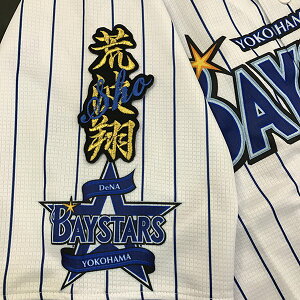 ■横浜DeNAベイスターズ荒波選手のアイロン接着用刺繍ワッペン アイロンにて簡単に接着可能です。 ※写真のユニフォーム・シルエットワッペン、応援歌ワッペン等他の装飾品はついておりません。 ネームワッペンのみとなります。 ※紛失
