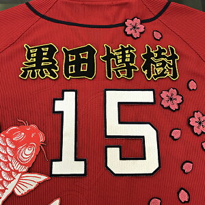 ■広島カープ黒田選手の名前、アイロン接着用刺繍ワッペン アイロンにて簡単に接着可能です。 ※写真のユニフォーム・背番号ワッペン、桜・鯉ワッペン等、他の装飾品はついておりません。 名前ワッペンのみとなります。 ※紛失防止のた