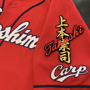 ■広島カープ 上本崇司選手ネームのアイロン接着用刺繍ワッペン アイロンにて簡単に接着可能です。 ※写真のユニフォーム・シルエットワッペン、応援歌ワッペン等他の装飾品はついておりません。 ネームワッペンのみとなります。 ※紛