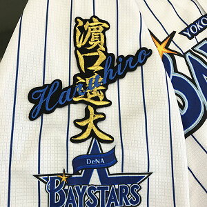■横浜DeNAベイスターズ濱口選手のアイロン接着用刺繍ワッペン アイロンにて簡単に接着可能です。 ※写真のユニフォーム・シルエットワッペン、応援歌ワッペン等他の装飾品はついておりません。 ネームワッペンのみとなります。 ※紛失