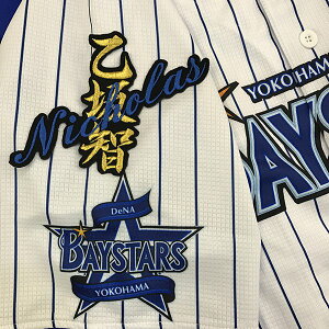 ■横浜DeNAベイスターズ乙坂選手のアイロン接着用刺繍ワッペン アイロンにて簡単に接着可能です。 ※写真のユニフォーム・シルエットワッペン、応援歌ワッペン等他の装飾品はついておりません。 ネームワッペンのみとなります。 ※紛失
