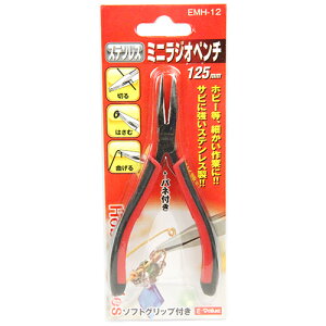 商品名 ステンレスミニラジオペンチ ブランド E-Value 規格 EMH-12 125mm 商品サイズ 幅53×高さ135×奥行き14mm 重量70g 用途 ホビー、精密作業等。 機能・特徴 サビに強く、素材にやさしいツールです。 ...