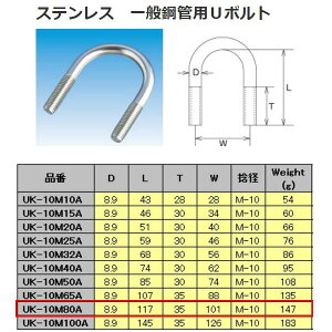 《メーカー》(株)水本機械製作所《品番》UK-12M80A《特長》●U字型金具の代表的な製品で、配管支持金具のスタンダード品です。●ステンレス製なので、錆びにくく美しいです。《用途》●配管用鋼管の固定、締め付けに使用。《仕様》●ね