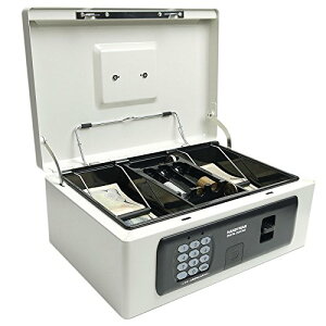 テンキータイプのキャッシュボックス(手提げ金庫)。上段トレイにはたっぷりの小銭、お札が収納でき、トレイの下にも通帳、印鑑、札束等を大容量に収納可能です。キーが不要のテンキー暗証番号式。暗証番号は1桁から最大8桁まで設