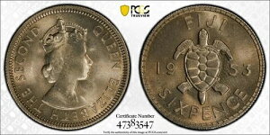 British Fiji, 1953 Elizabeth II Sixpence, 6 Pence. PCGS MS 66. 800,000 Mintage商品について組成:銅ニッケル認証番号:393527.66/47383547純度...