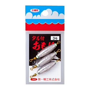 種類。タル型サルカン夜光玉付。ITEM INFORMATIONサイズ(号)3入数(個)3タル付 オモリ 3号JAN4995915220925